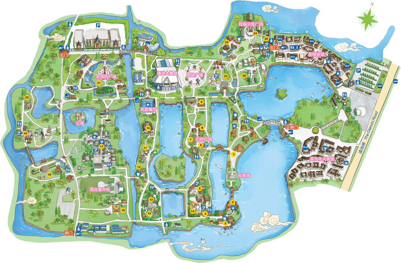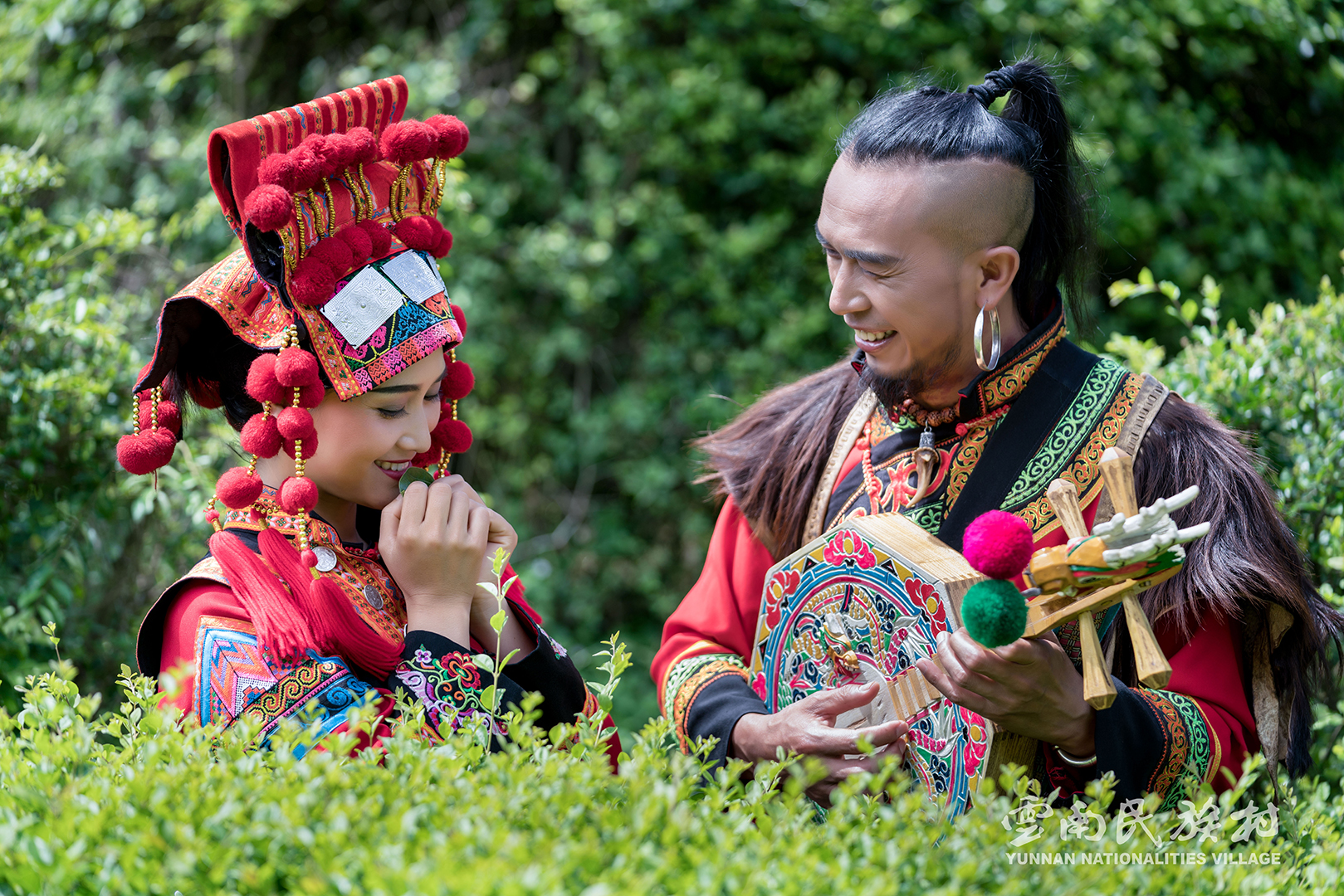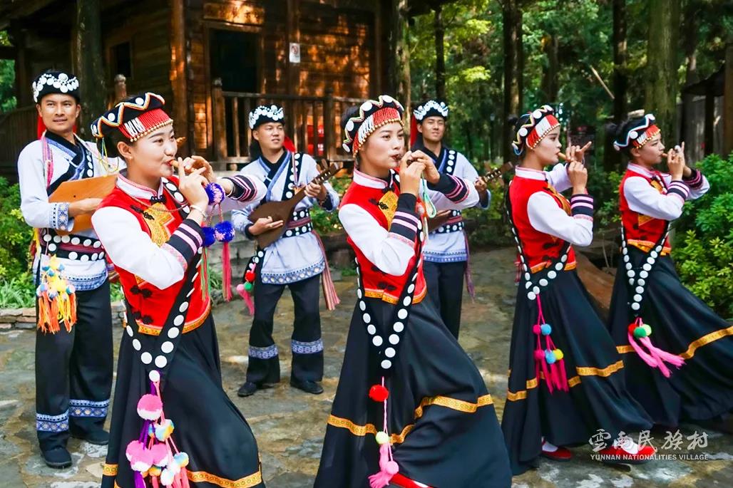 彝族在云南境內(nèi)約471萬(wàn)人,是省內(nèi)人口最多、分布最廣的少數(shù)民族,主要聚居在金沙江、元江流域和哀牢山、無(wú)量山腹地。彝族是一個(gè)能歌善舞的民族,民間打歌、跳樂(lè)之風(fēng)盛行,大三弦、跌腳舞久負(fù)盛名?;鸢压?jié)是彝族最具特色的民族節(jié)日。彝族村占地50余畝,三虎浮雕墻與虎頭內(nèi)祖師形象表現(xiàn)了彝族虎鷹文化。太陽(yáng)歷廣場(chǎng)圖騰柱上有太陽(yáng)、虎、火和八卦圖形象,周?chē)h(huán)繞著10個(gè)朝向不同的月球造型,外圓周有12生肖石雕。依山而建的“...